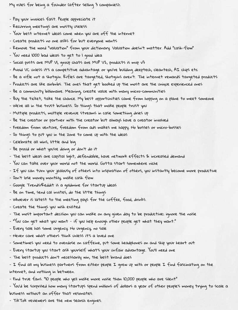 My rules for being a founder (after selling 3 companies): #solofounder #growth - Pay your invoices fast. People appreciate it - Recurring meetings are mostly useless - Your best internet ideas come when you are off the internet - Create products no one asks for but everyone wants - Remove the word "valuation" from your dictionary. Valuation doesn't matter. Add "cash-flow" - You need 1000 bad ideas to get to 1 good idea - Social posts are MVP V1, group chats are MVP V2, products is mvp v3 - Avoid VC unless it's a competitive advantage or you're building deeptech, cleantech, AI chips etc - Be a rifle not a shotgun. Rifles are targeted, shotguns aren't. The internet rewards targeted products - Products are like airbnbs. The ones that get booked up the most are the unique experienced ones - Be a community billionaire. Meaning, create value with many micro-communities -Buy the ticket, take the chance. My best opportunities came from hopping on a plane to meet someone - We’re all in the trust business. Do things that make people trust you - Multiple products, multiple revenue streams in case something dries up - Freedom from venture, freedom from ads makes me happy. No bosses or micro-bosses - Do things to put you in the zone to come up with the ideas - Celebrate all wins, little and big - Be proud or what you're doing or don't do it - The best ideas are capital light, defendable, have network effects & increased demand - You can take over your world not the world. Gotta start somewhere niche - If you can turn your jealousy of others into inspiration of others, you instantly become more productive - Don’t lose money monthly, make cash flow - Google Trends/Reddit is a goldmine for startup ideas - Be on time, send cal invites, do the little things - Whoever is latest to the meeting pays for the coffee, food, drinks. - Create the things you wish existed - The most important decision you can make on any given day to be productive: ignore the noise - "You can get what you want - if you help enough other people get what they want.” - Every sale has some urgency. No urgency, no sale - Never care what others think unless it's a loved one - Sometimes you need to overdose on caffeine, put some headphones on and ship your heart out - Every startup you start ask yourself what's your unfair advantage. You'll need one - The best products don't necessarily win, the best brand does - I find all my business partners from either people I grew up with or people I find fascinating on the internet, and nothing in between. - Find true fans. “10 people who yell make more noise than 10,000 people who are silent” - You’d be surprised how many startups spend millions of dollars a year of other people’s money trying to scale a business without an offer that resonates. - TikTok reviewers are the new search engines.